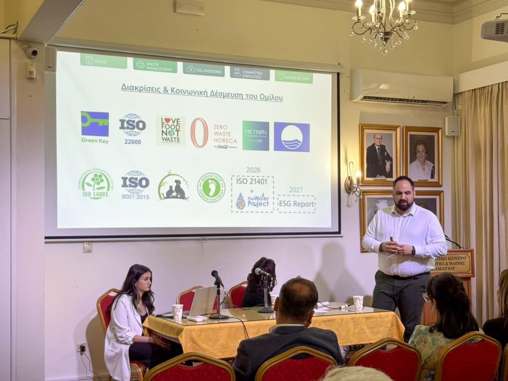 Στο πλαίσιο αυτής της στρατηγικής, πραγματοποιήθηκαν διαδραστικά εργαστήρια περιβαλλοντικής ευαισθητοποίησης σε μαθητές των δημοτικών σχολείων Μαλώνας και Παραδεισίου, με επίκεντρο το ατομικό αποτύπωμα άνθρακα και πρακτικούς τρόπους καθημερινής περιβαλλοντικής υπευθυνότητας. Η προσέγγιση βασίστηκε στην άμεση επαφή και την απλότητα του μηνύματος, καλλιεργώντας από νωρίς οικολογική συνείδηση στους μελλοντικούς πολίτες της Ρόδου. Παράλληλα, συνεχίστηκε η πολυετής σύνδεση του ομίλου με την ακαδημαϊκή κοινότητα. Φοιτητές του Μεταπτυχιακού Προγράμματος Σπουδών Περιβαλλοντικής Εκπαίδευσης του Πανεπιστημίου Αιγαίου, συμμετείχαν σε ακόμη μια πρακτική εκπαίδευση εντός ξενοδοχειακής μονάδας του ομίλου, παρακολουθώντας από κοντά πώς οι αρχές της αειφορίας και της βιώσιμης ανάπτυξης εφαρμόζονται καθημερινά στη λειτουργία ενός σύγχρονου ξενοδοχείου. Η εξωστρέφεια του ομίλου εκφράστηκε και μέσω της συμμετοχής του Quality Manager ως ομιλητή στην εσπερίδα του Μητροπολιτικού Κολλεγίου Ρόδου, όπου παρουσίασε την εφαρμογή σύγχρονων περιβαλλοντικών πρακτικών στον ξενοδοχειακό τομέα, στο πλαίσιο της προσέγγισης ESG.